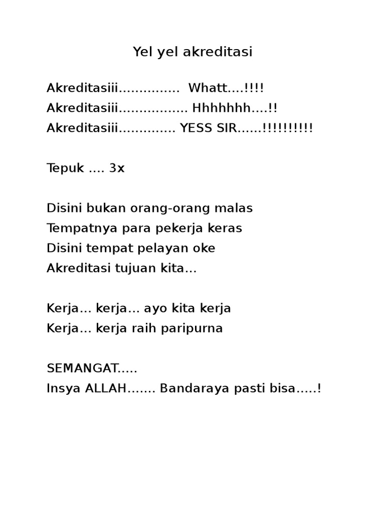 Yel Yel Semangat Kerja Cara Golden from imgv2-2-f.scribdassets.com Dengan yel yel ini semua orang dalam kelompok akan tersulut semangatnya untuk ikut berjuang bersama tim atau regu. Download your search result mp3, or mp4 file on your mobile, tablet, or pc. Mengikuti kegiatan pramuka bisa jadi pelengkap kegiatan belajar di dalam kelas. Buku matematika untuk sd mi kelas vi kurikulum 2013. Freddy arief budiman 2 years ago. Lirik lagunya sangatlah simpel, namun kajian musiknya sangat bagus dan lagu ini cocok dijadikan contoh yel yel kelas, karena kebanyakan. Are you see now top 10 yel yel singkat untuk nama nabila results on the web. 0 ratings0% found this document useful (0 votes).